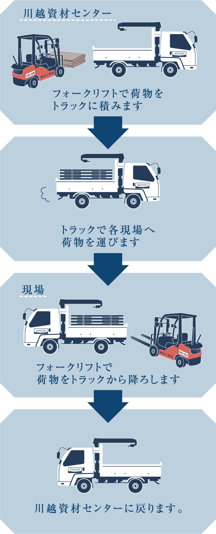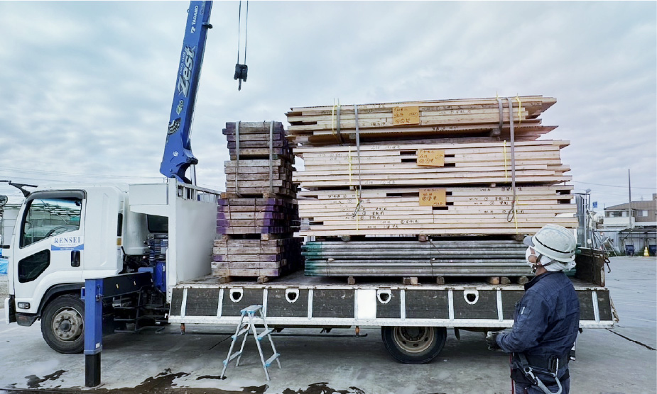 現場から川越資材センターに戻ってきたら、翌日の宵積みを必ずセンタースタッフにて実施します。