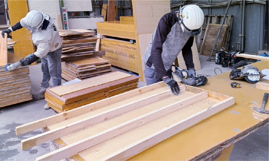 加工図をもとにベニヤや桟木を加工し型枠を製作します。