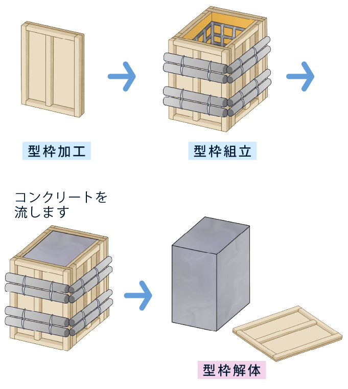 型枠解体とは、コンクリートが固まったら型枠を解体することです。
